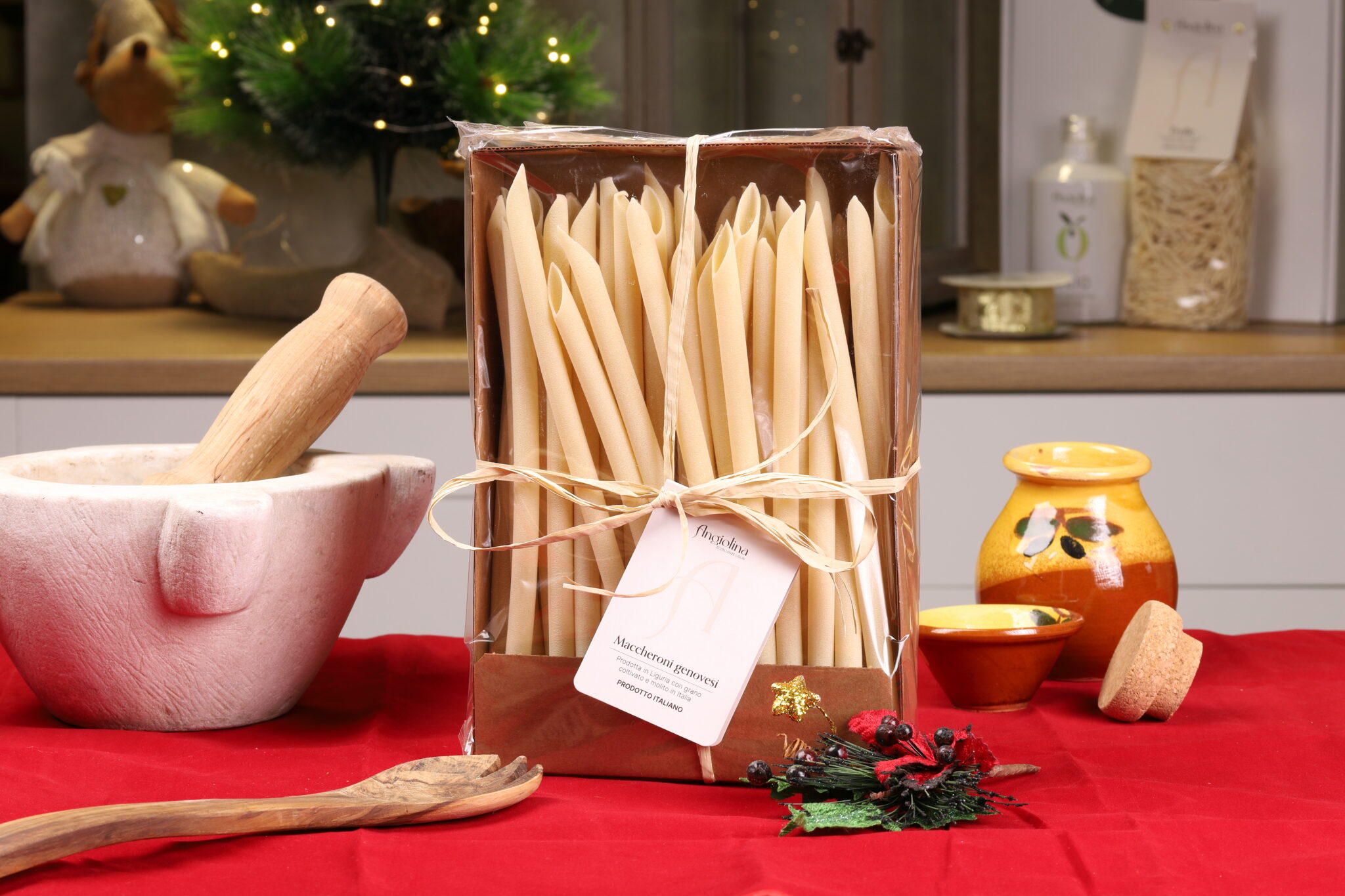 I maccheroni genovesi sono maccheroni lunghi, pensati per essere serviti in brodo di cappone, accompagnati da polpettine di salsiccia. Il risultato è un primo piatto caldo, confortante e profondamente legato alla cucina delle feste.
